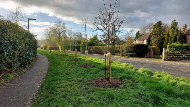 Planted on the 22nd November, this lovely avenue of nine flowering cherry trees by the Lower Road Rec! These, along with the five planted in Spring, will look beautiful next year and every year after! Well done to Frances Fancourt and her Tree Warden team and for SCC for funding and for making this happen - a great result!