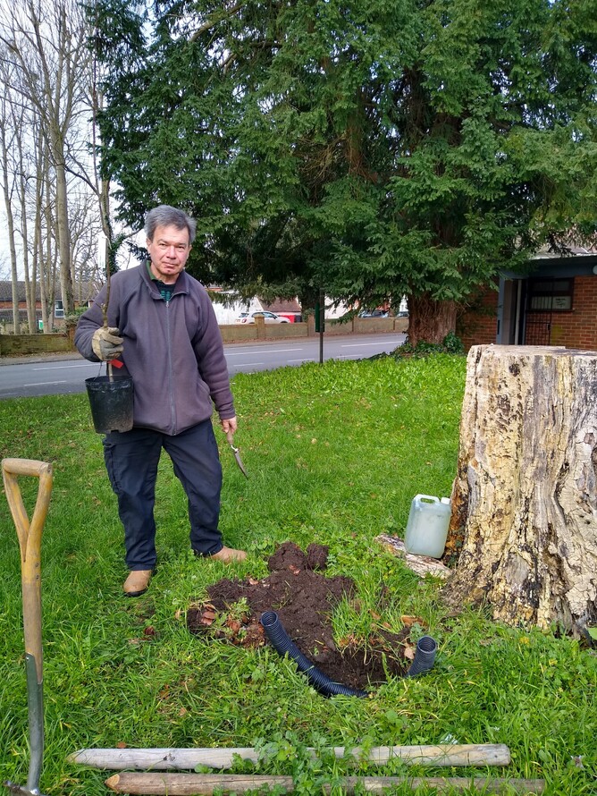 The Bookham Tree Wardens have planted five heritage apple trees at Lower Shott. The trees were donated by Gillian Bailey which Gillian has funded in honour of her 80th birthday. The variety planted is "Claygate Pearmain".