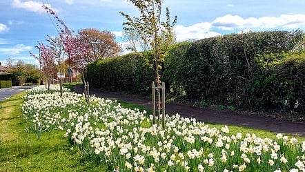 This verge was a real highlight in April, with daffodils and flowering cherries looking absolutely superb. The cherry trees are now well established, and late‑flowering daffodils were deliberately chosen to bloom alongside them, creating a beautifully timed spring display....