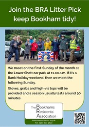 On the first Sunday in the month Bookham residents meet at Lower Shott car park at 11.00 am to give Bookham a tidy up. Under the direction of BRA Litter Pick Co-ordinators, Margaret Lawson and Michael Hebert, the team spread out and spend on average 90 minutes litter picking...